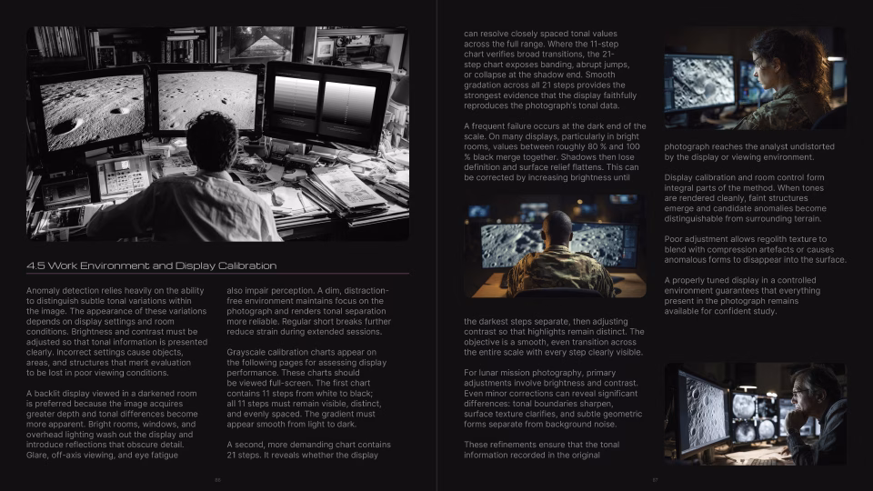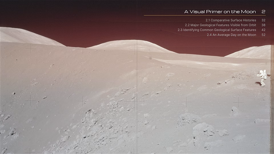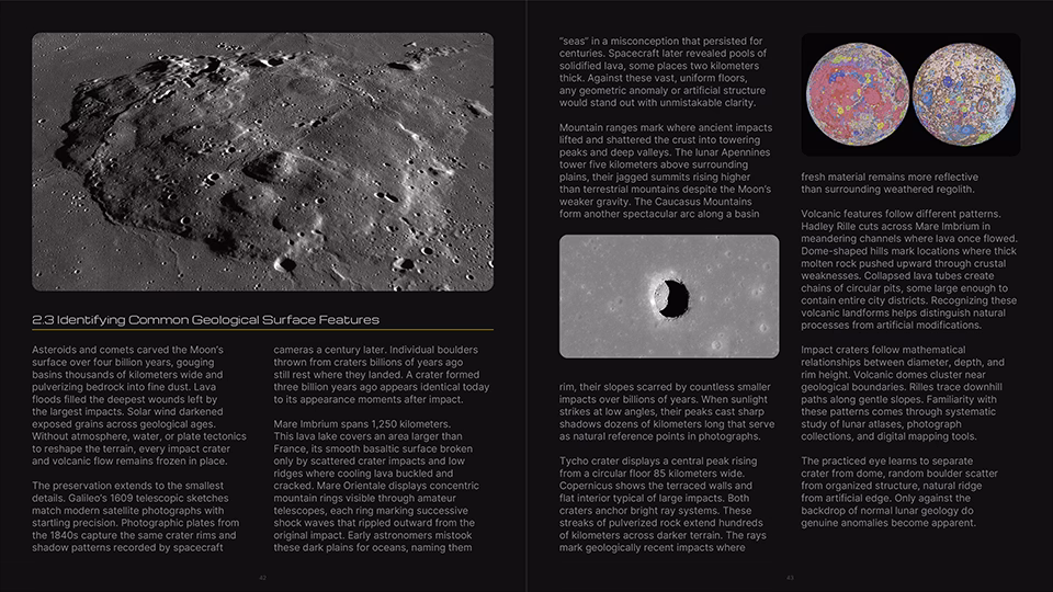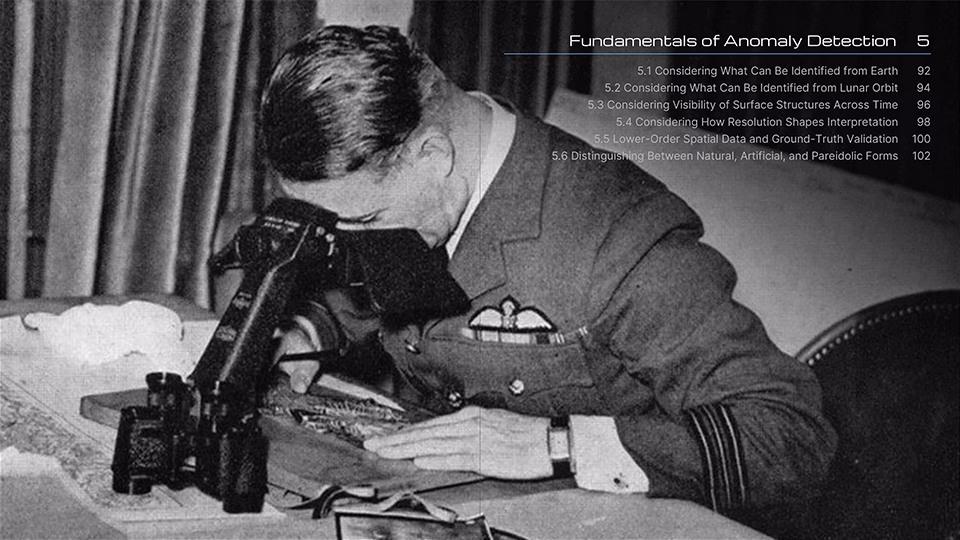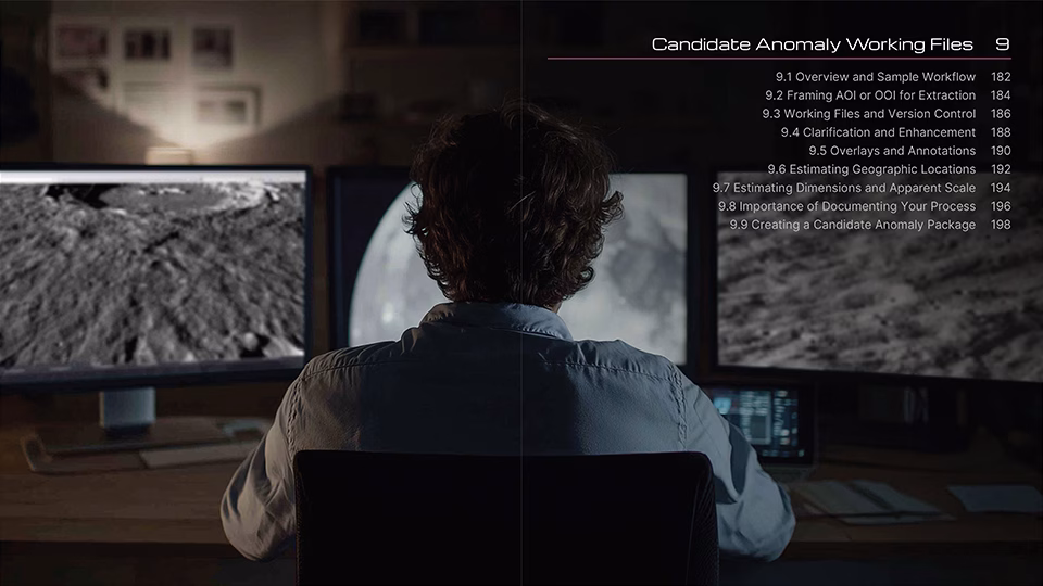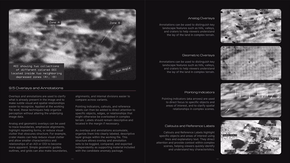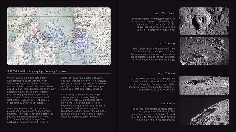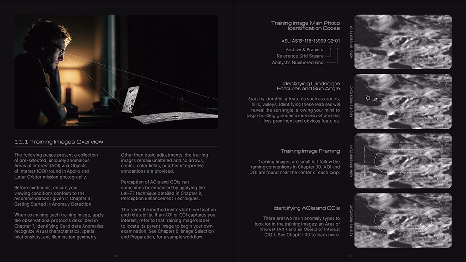 The front half of the guide (Chapters 1–10) is highly detailed and beautifully illustrated, spanning over 200 pages and featuring 422 illustrations covering humanity’s story of life on the Moon, a visual primer of common geological features, an overview of lunar mission photography, how to get started in anomaly detection, the fundamentals of anomaly detection, image selection and preparation, identification and description of Areas of Interest (AOI) and Objects of Interest (OOI), perception-enhancement techniques, best practices when working with candidate anomalies, and how to be your own worst critic before socializing your research.
