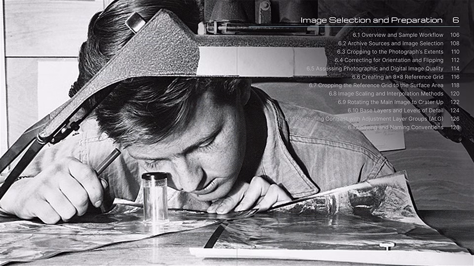 Drawing from WWII aerial photo interpretation, aerial archaeology, and modern digital imaging practices, the field guide establishes an entirely new set of workflows designed to aid the analyst in the identification of anomalous decameter- and kilometer-scale geometric structures and modified terrain. These methods are illustrated using Arizona State University’s high-resolution digital scans of NASA’s lunar mission photography, many of which resolve detail at or beyond the resolution of the original film grain.
